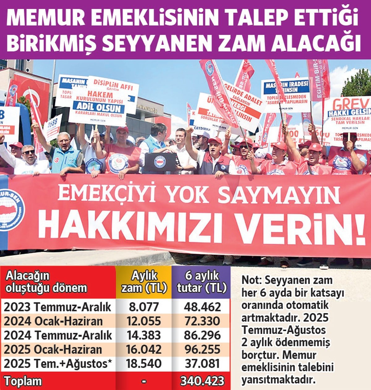 Memur emeklisi 26 aydır seyyanen zam yolu gözlüyor. Memur emeklilerinin yaptığı hesaba göre, Cumhurbaşkanı Tayyip Erdoğan’ın 2023 seçimlerinde vadettiği 8 bin 77 liralık seyyanen zam nedeniyle her bir emeklinin 340 bin 423’er lira alacağı oluştu. Memurlarla birlikte memur emeklisine de seyyanen zam yapılmış olsaydı 8 bin 77 liralık zam katsayı artışlarıyla bugün 18 bin 540 liraya çıkacak ve tüm memur emeklilerinin aylığında bu tutarda artış olacaktı. Böylece en düşük memur emeklisinin aylığı bugün 22 bin 670 lira yerine 41 bin 157 liraya çıkacak, bu aylık 2026 başında 49 bin 232 lira olacaktı. Memur emeklisine bu zam yapılsa, açlık savaşı veren 13 milyonu aşkın işçi, esnaf ve çiftçi emeklisi için de bir umut ışığı doğacaktı.