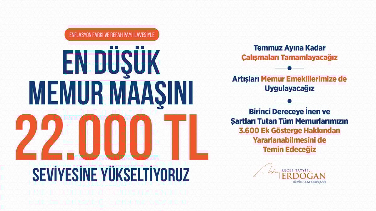 Cumhurbaşkanı Erdoğan 2023’de yapılan genel seçim öncesi, “En düşük memur maaşını 22 bin lira seviyesine yükseltiyoruz. Maaşlardaki bu artışları otomatik olarak memur emeklilerimize de yansıtıyoruz. Milletimize hayırlı olsun” açıklaması yaptı. Erdoğan ve AKP seçimi kazandı, Temmuz 2023’te 8 bin 77 liralık seyyanen zamla birlikte en düşük memurun maaşını 22 bin liraya çıkardı.