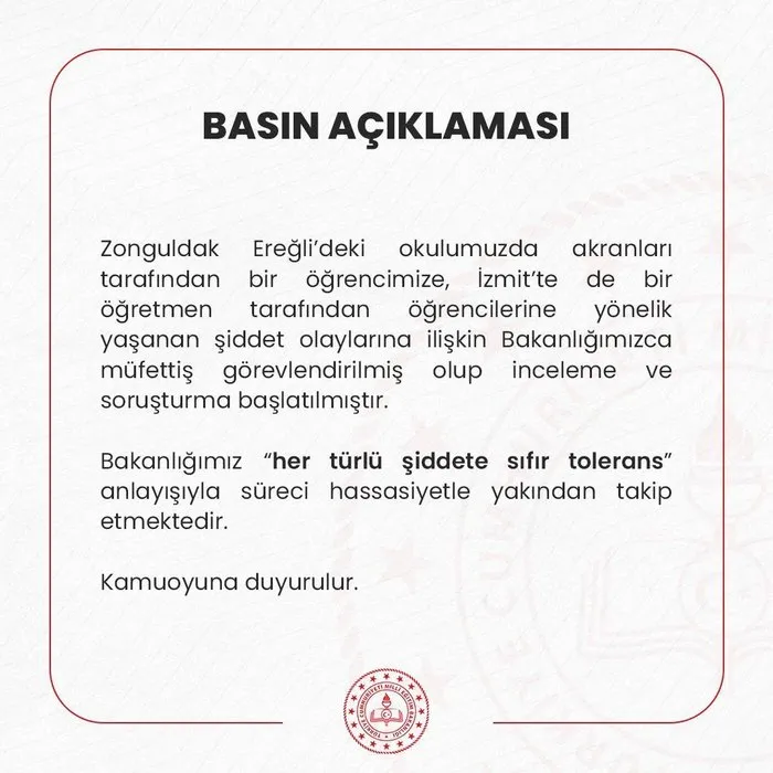 Milli Eğitim Bakanlığı, sosyal medyada tepki çeken darp görüntülerine ilişin bir açıklama yaptı. Bakanlıktan yapılan açıklamada, "Zonguldak Ereğli'deki okulumuzda akranları tarafından bir öğrencimize, İzmit'te de bir öğretmen tarafından öğrencilerine yönelik yaşanan şiddet olaylarına ilişkin Bakanlığımızca müfettiş görevlendirilmiş olup inceleme ve soruşturma başlatılmıştır." ifadelerine yer verildi.