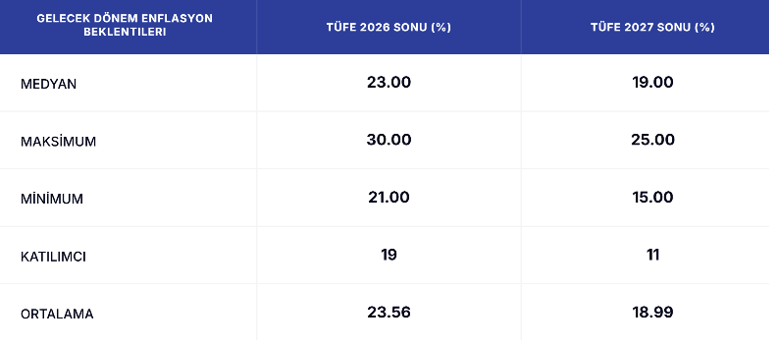 Ekonomistlerin 2026 sonu enflasyon beklentisi yüzde 23,00 seviyesinde bulunuyor. Yıl sonu tahminlerinde en yüksek beklentiye sahip ekonomist yüzde 30,00 olurken, en düşük tahmin veren ekonomist ise yüzde 21,00 oldu.