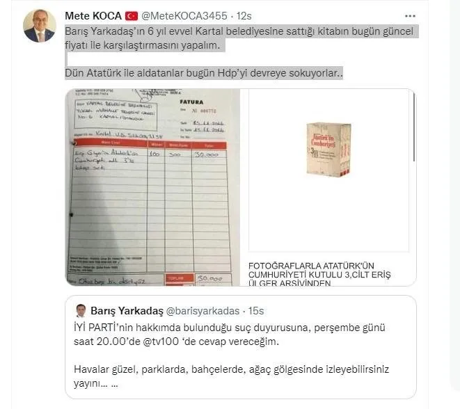 Öte yandan CHP'li Gürsel Tekin'in, 'HDP'ye bakanlık verilebilir' sözleri sonrası karışan 6'lı masa ittifakında karşılıkla ithamlar da başladı. CHP Eski Milletvekili Barış Yarkadaş'ın, "HDP'li seçmenlerin katkısıyla seçilen büyükşehir belediye başkanlıklarının dağıttığı dairelerin daire başkanları olacaksınız, genel müdürleri olacaksınız, yakın çevreniz büyükşehir belediyelerinden ihale alacak." sözlerine İYİ Parti Genel Merkez Yerel Yönetimler Başkan Yardımcısı Mete Koca'dan sert bir cevap geldi. Koca, sosyal medya hesabından yaptığı paylaşımda "Barış Yarkadaş'ın 6 yıl evvel Kartal belediyesine sattığı kitabın bugün güncel fiyatı ile karşılaştırmasını yapalım. Dün Atatürk ile aldatanlar bugün Hdp'yi devreye sokuyorlar." ifadelerini kullandı.