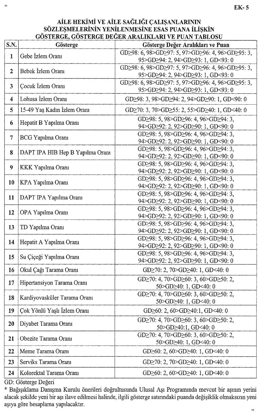 “(1) Sözleşme süresi sonunda görevine devam etmek isteyen aile hekimi ve aile sağlığı çalışanının sözleşmeleri; gebe, lohusa, bebek-çocuk izlemleri, bağışıklama, kronik hastalık tarama ve izlemleri, kanser taramaları gibi koruyucu ve önleyici sağlık hizmetleri kapsammda bu Yönetmeliğin eki (EK-5 AİLE HEKİMİ VE AİLE SAĞLIĞI ÇALIŞANLARININ SÖZLEŞMELERİNİN YENİLENMESİNE ESAS PUANA İLİŞKİN GÖSTERGE, GÖSTERGE DEĞER ARALIKLARI VE PUAN TABLOSU)’nda belirlenen göstergelere göre aile hekimliği biriminin aldığı toplam puanın 70 ve üzerinde olması halinde yenilenir. Bu değerlendirme bir sözleşme döneminde altı ay ve üzeri çalışan sözleşmeli aile hekimi ve aile sağlığı çalışanı için uygulanır.”