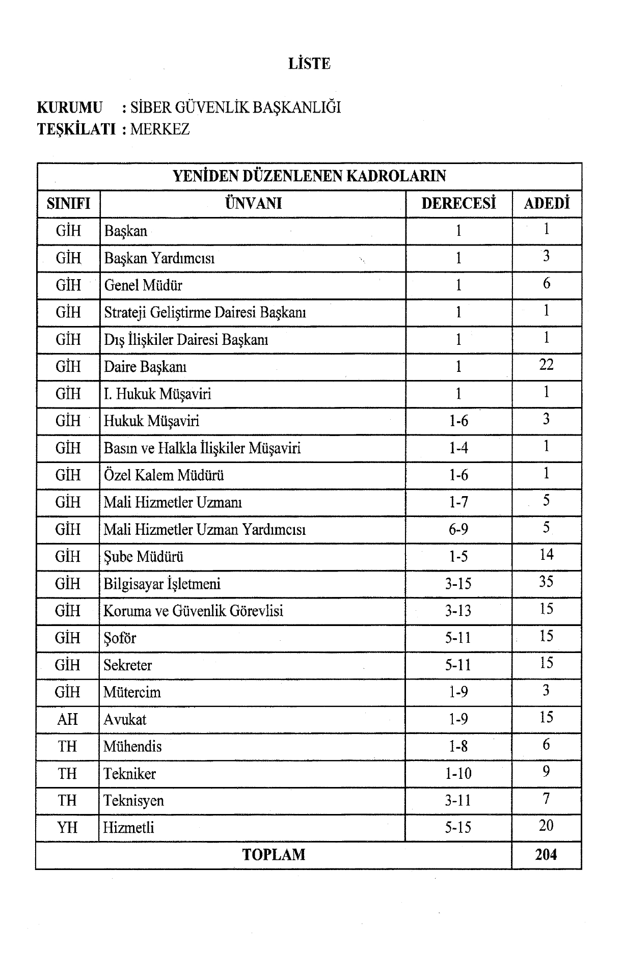 MADDE 4- 2 sayılı Genel Kadro ve Usulü Hakkında Cumhurbaşkanlığı Kararnamesinin eki (I) sayılı Cetvelin Siber Güvenlik Başkanlığı bölümü ekli listede yer aldığı şekilde yeniden düzenlenmiştir.