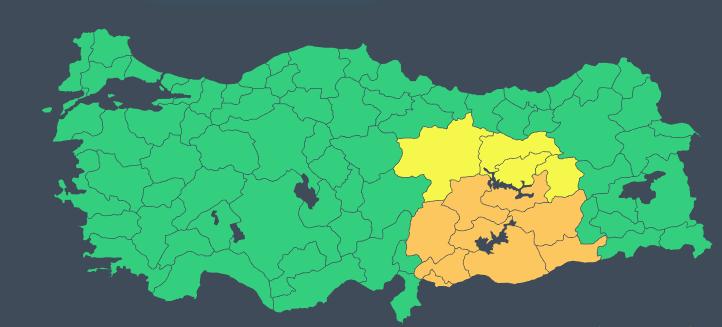 Hava durumu tehlikelidir: Tahmin edilen meteorolojik hadise sıklıkla görülmemektedir. Hasar ve kayıpların oluşması muhtemeldir. Çok tedbirli olmalı, güncel meteorolojik koşullar ve tahminler takip edilmelidir.