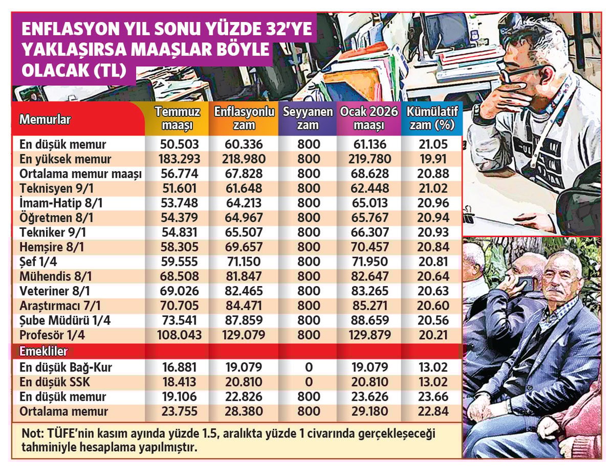 Enflasyonda büyük bir sürpriz yaşanmazsa yılın başında milyonlarca işçi, esnaf ve çiftçi emeklisine sadece yüzde 13 civarında zam yapılacak. Memur ve memur emeklilerine de Enflasyon farkı, hakem zammı ve seyyanen zam dahil en fazla yapılacak zam oranı en düşük memurda yüzde 21’i zor bulacak. Yeni yılı yine zamlarla karşılayacak olan dar gelirli vatandaş, maaşlarına yapılacak cüce zam karşısında yine hayal kırıklığı yaşayacak.