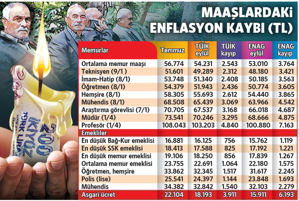 Enflasyon, memur ve emeklilerin temmuzda aldığı zammı da yuttu. Temmuzda 50 bin 503 liraya çıkarılan en düşük memur aylığının alım gücü ENAG’a göre 47 bin 155 liraya, en düşük memur emeklisinin 19 bin 106 lira yapılan aylığının alım gücü de eylül başı itibarıyla 17 bin 839 liraya geriledi. Aynı şekilde temmuzda 16 bin 881 lira olan en düşük Bağ-Kur emekli aylığının alım gücü 15 bin 762 liraya geriledi. En düşük işçi emeklisinin 18 bin 413 lira olan aylığının alım gücü de 17 bin 192 liraya düştü.