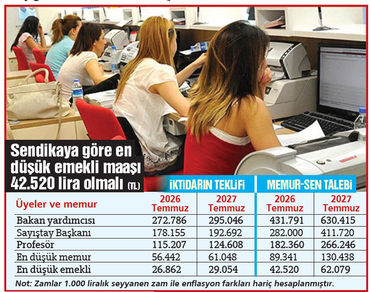 Kurul, sabit gelirli memur ve emeklilerin haline acıyıp Memur-Sen’in zam talebini kabul ederse en düşük devlet memurunun maaşı enflasyon farkları ve 1.000 liralık seyyanen zam hariç 47 bin 522 liradan Temmuz’da 2026’da 89 bin 341 liraya, Temmuz 2027’de 130 bin 438 liraya çıkacak. En düşük emekli memurun aylığı da 22 bin 617 liradan seneye 42 bin 520 liraya, Temmuz 2027’de de 62 bin 79 liraya çıkacak. Bu zam hem üyeleri hem de sabit gelirlileri rahatlatacak, ancak üyeler bu zammı onaylarsa büyük olasılıkla koltuklarını kaybedebilir.