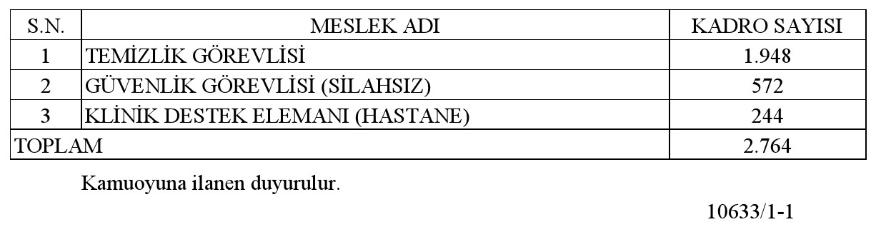 Sağlık Bakanlığı, taşra teşkilatında istihdam edilmek üzere 1.948 temizlik görevlisi, 572 silahsız güvenlik görevlisi ve 244 klinik destek elemanı alımı yapacak. Başvurular 8-13 Ekim tarihleri arasında İŞKUR üzerinden elektronik ortamda yapılacak.