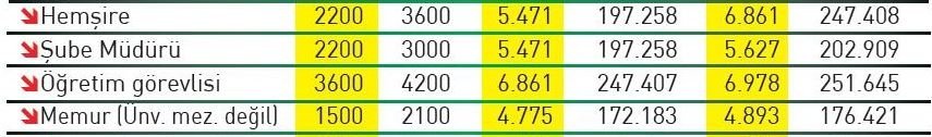Ek göstergesi 2200'den 3600'e çıkartılanların çalışırken aldığı maaşlar yaklaşık 60 lira, aylıkları 1391 TL, emekli ikrâmiyeleri de 50 bin 145 lira artacak. Lisans mezunu hemşireler, din görevlileri de bu grupta yer alıyor.